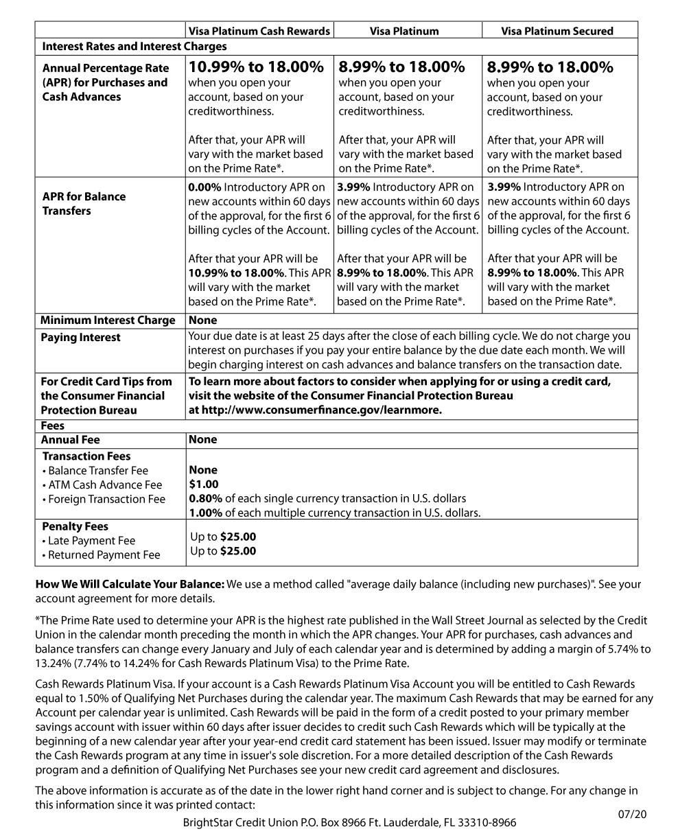 *The Prime Rate used to determine your APR is the highest rate published in the Wall Street Journal as selected by the Credit Union in the calendar month preceding the month in which the APR changes. Your APR for purchases, cash advances and balance transfers can change every January and July of each calendar year and is determined by adding a margin of 5.74% to 13.24% (7.74% to 14.24% for Visa Platinum Cash Rewards) to the Prime Rate.
